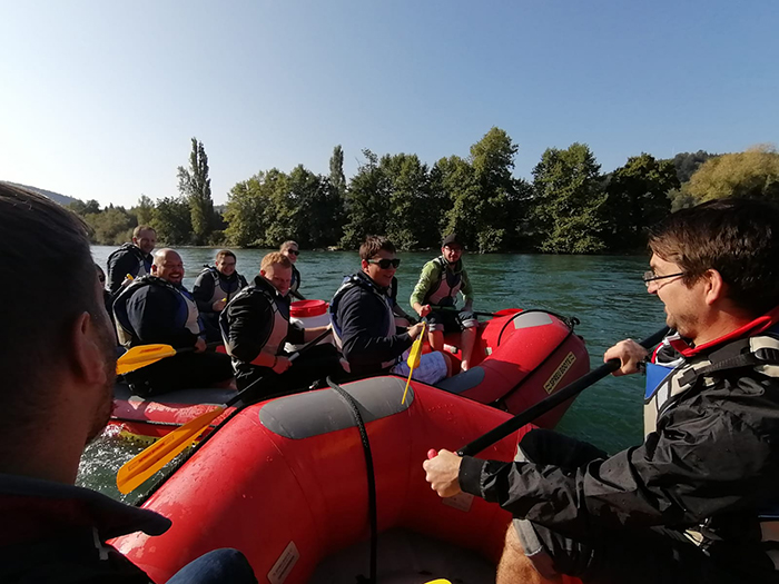 Schon um 8 Uhr fuhren wir bei herrlichem Sonnenschein mit dem Bus über den Hotzenwald nach Waldshut und weiter nach Reckingen. Ausgestattet mit einer Schwimmweste und nach einer kurzen Einweisung wechselten wir dort das Fortbewegungsmittel,  unsere Wahl fiel hierbei auf zwei Raftingboote. Voller Tatendrang starteten wir Flussabwärts in Richtung Leibstadt. Nach einer kurzen Eingewöhnungsphase klappte das Paddeln in einem Boot ganz gut, das andere Boot fand die Drehungen auf dem Rhein auch nicht so schlecht. Mit viel Spaß und nicht ganz trocken erreichten wir nach etwa drei Stunden unser Ziel Leibstadt. Dort wartete dann ein leckeres Vesper auf uns.