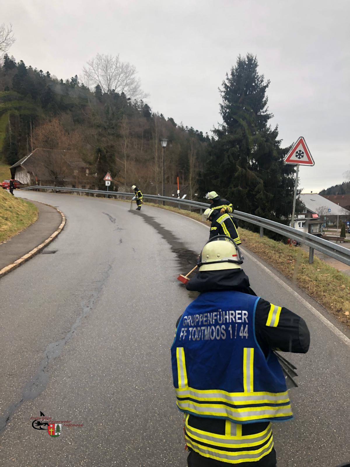 Von einer Polizeistreife wurden wir gerufen um eine Ölspur im Ortsbereich zu beseitigen. Die verunreinigten Stellen wurden abgestreut und die Straße mittels Warnschildern abgesichert.