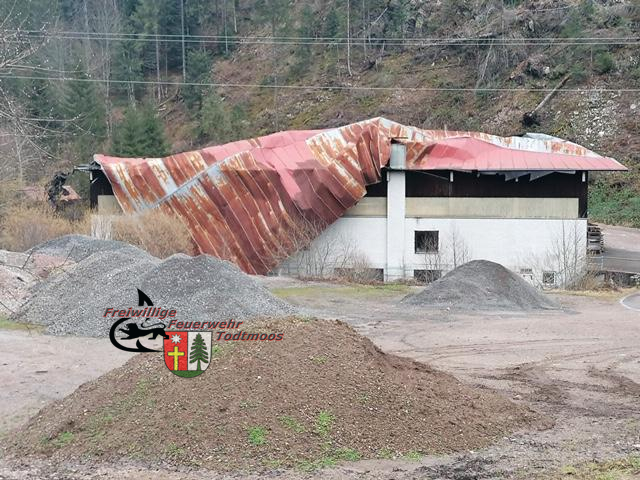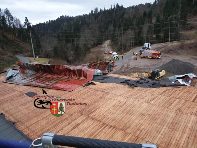 Da ein Betreten der Dachfläche mit dem losen Blech zu gefährlich war wurde zunächst die Talstraße für den Verkehr gesperrt und der Energiedienst verständigt.