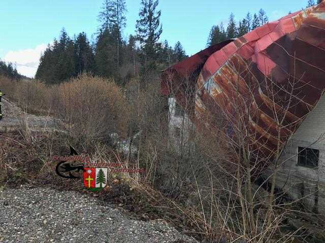 Der größte Teil des Blechs hing lose auf dem Dach und an der Fassade in Richtung Bach. Durch den Regen lief immer wieder Wasser ins Gebäude.