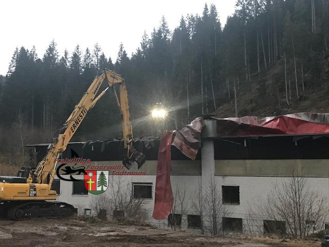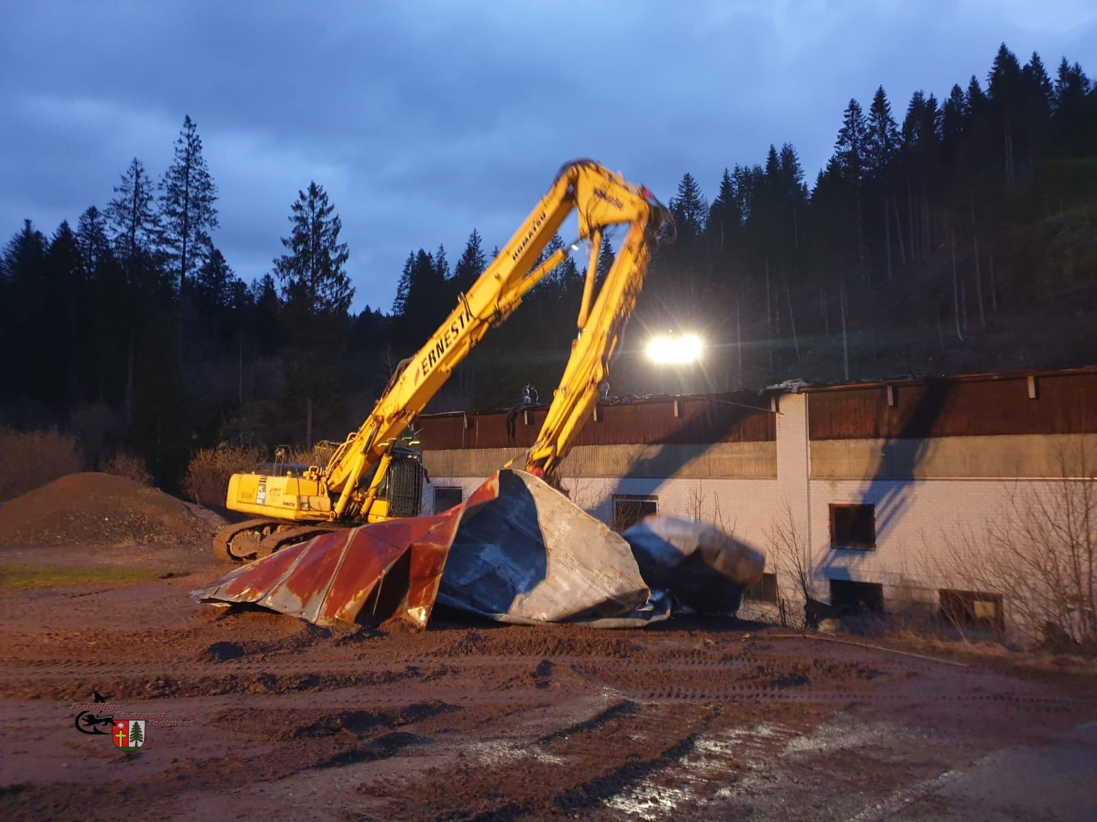 Nachdem das Blech vom Dach gezogen wurde, beförderte das Schrottblech ein weiterer Bagger der Firma Daniel Stoll Bau in zwei bereitgestellte Absetzmulden.