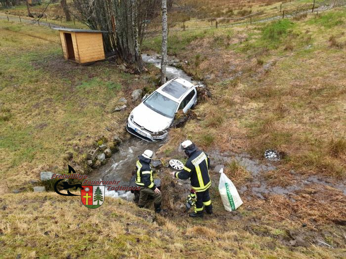 Am Nachmittag des Fasnachtsdienstags wurden wir zur Beseitigung einer Ölspur nach einem Verkehrsunfall alarmiert. Beim Eintreffen an der Unfallstelle fanden wir ein ca. 20 Meter von der Fahrbahn abseits stehendes Fahrzeug auf einer Wiese in einem kleinen Bachlauf vor.