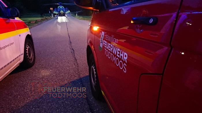 Am frühen Dienstagmorgen wurden wir zu einem Verkehrsunfall alarmiert: ein PKW überschlug sich im Kurvenbereich und blieb auf dem Dach liegen. Bis zum eintreffen des Rettungsdienstes betreuten wir die verunfallte Person, ebenso sicherten wir die Unfallstelle ab und leuchteten diese aus. Da die Fahrerin des PKW über Rückenschmerzen klagte, wurde sie mit dem Rettungshubschrauber in eine Klinik transportiert. Wir richteten daher einen Hubschrauberlandeplatz in Todtmoos-Au ein. Nach der Unfallaufnahme durch die Polizei unterstützten wir das Abschleppunternehmen und reinigten die Fahrbahn.