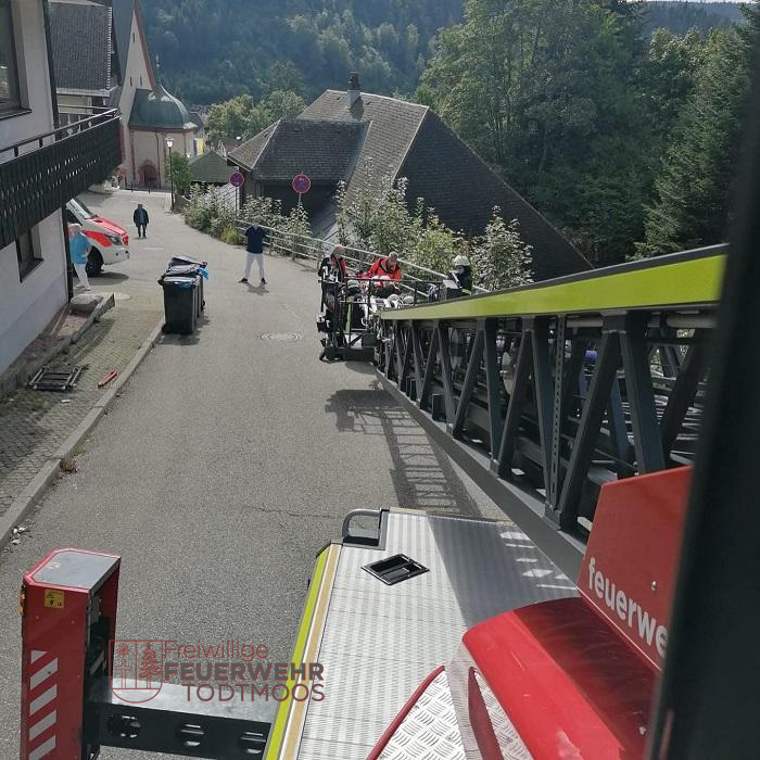 Am Vormittag wurden wir in die Kirchbergstraße zur Unterstützung des Rettungsdienstes alarmiert. Ein Patient wurde mittels der Krankentragelagerung der Drehleiter aus dem 3. OG zum Vorplatz des Pflegeheims transportiert und dort wieder dem Rettungsdienst übergeben.