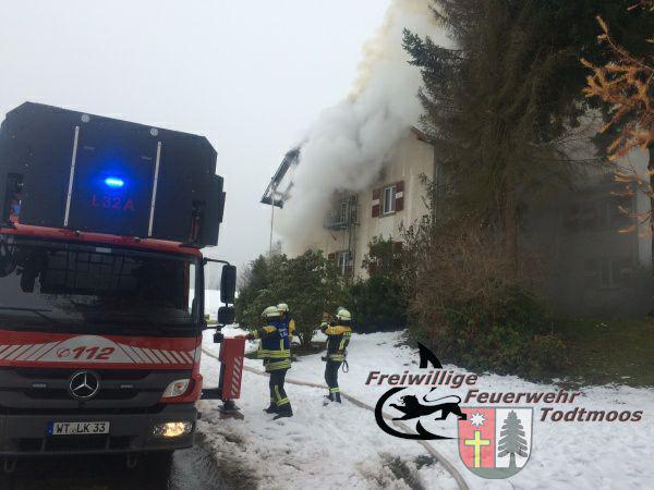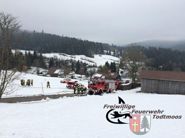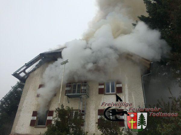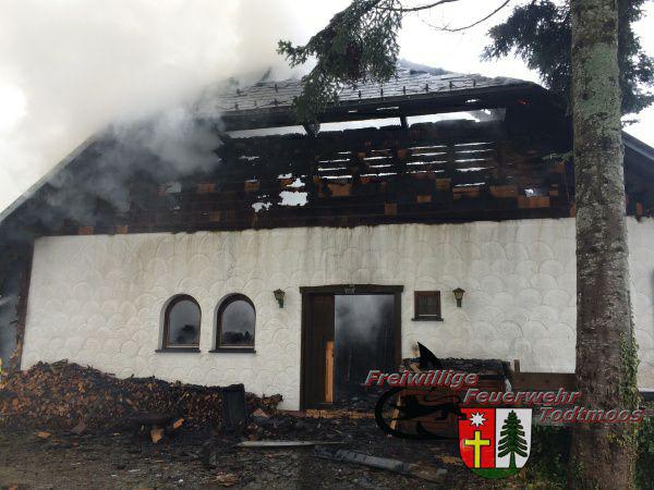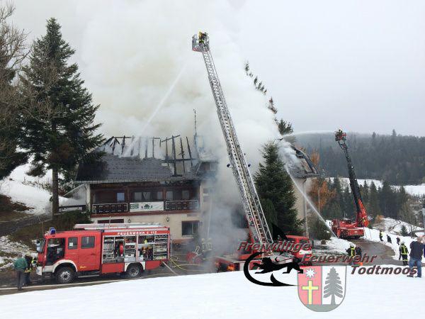 Schon auf der Anfahrt war sichtbar dass es sich um einen Großbrand handelt worauf die Feuerwehr Sankt Blasien nachalarmiert wurde. Von der automatisch mitalarmierten Feuerwehr Herrischried wurden noch weitere Kräfte nachalarmiert. Zum Glück befanden sich keine Personen mehr im Gebäude, diese waren am Sonntag abgereist.
