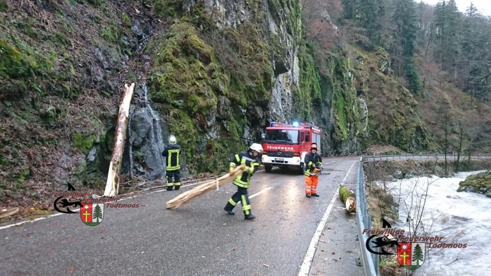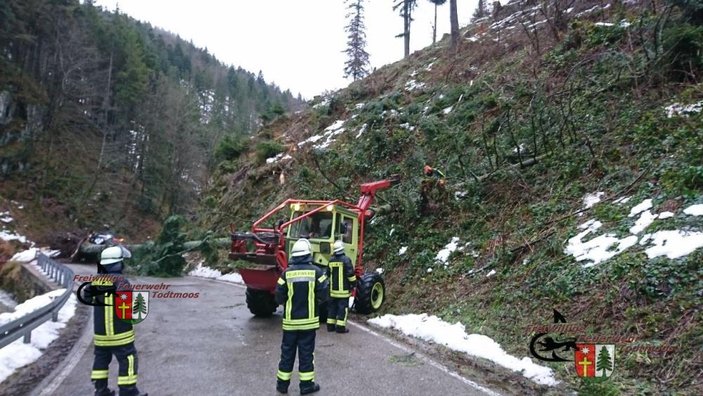 Während Sturmtief Burglind zum Jahresbeginn über Deutschland zieht und schwere Schäden anrichtet, wurden wir ins Wehratal gerufen. Hier versperrte ein Baum die Fahrbahn.